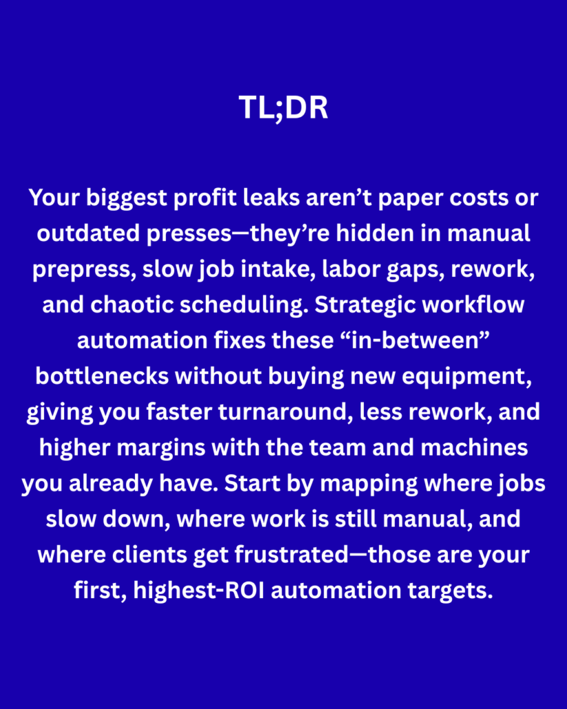 Today, I’m going to show you the five margin killers that sabotage print shops and the automation moves that fix them fast. No theory. No fluff. Just the patterns I’ve seen destroy profitability and the systematic solutions that actually work.